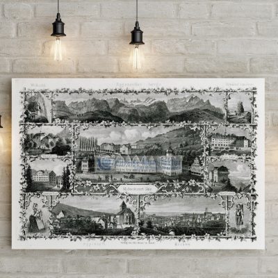Dieses historische Souvenirblatt ist weit mehr als ein dekoratives Wandbild. Es vereint Berglandschaft, Stadtansichten und Alltagsleben zu einem stimmungsvollen Gesamtwerk und vermittelt die besondere Atmosphäre der Appenzeller Alpen. Ideal für Liebhaber der Schweiz, Sammler historischer Souvenirblätter und alle, die sich ein kunstvolles Stück alpiner Geschichte in ihr Zuhause holen möchten.