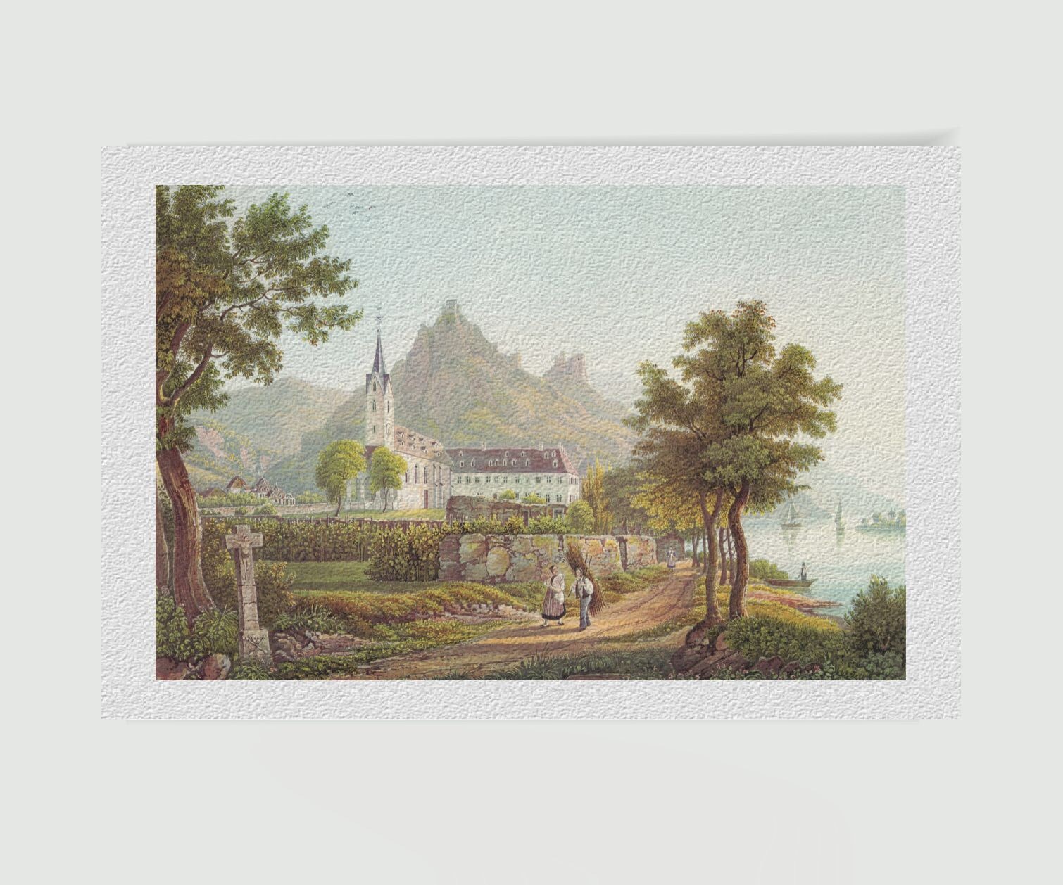 Dieses Kunstwerk ist ein interessantes Zeugnis der Rheinromantik und bietet einen atmosphärischen Blick auf eine historische Kulturlandschaft. Die Verbindung aus landschaftlicher Harmonie und sagenhaftem Hintergrund macht den Kupferstich zu einem reizvollen Motiv für:
