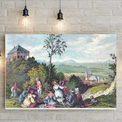 Im Vordergrund des Stahlstichs zeigt sich eine vergnügte Menschenrunde, die sich auf einer Wiese versammelt hat. Einige Personen sitzen entspannt, vermutlich bei einem Picknick, während andere stehen oder ausgelassen tanzen. Diese lebendige Szene verleiht dem Motiv eine heitere, beinahe festliche Atmosphäre.