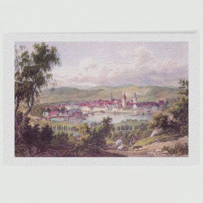 Dieses Kunstwerk lässt sich mit nur einem Wort beschreiben: wundervoll. Im Vordergrund des Stahlstichs sind Bäume, Büsche und ein Feld, das gerade bearbeitet wird, zu erkennen. Die ländliche Szene vermittelt Ruhe und bildet einen harmonischen Übergang zur Stadt.