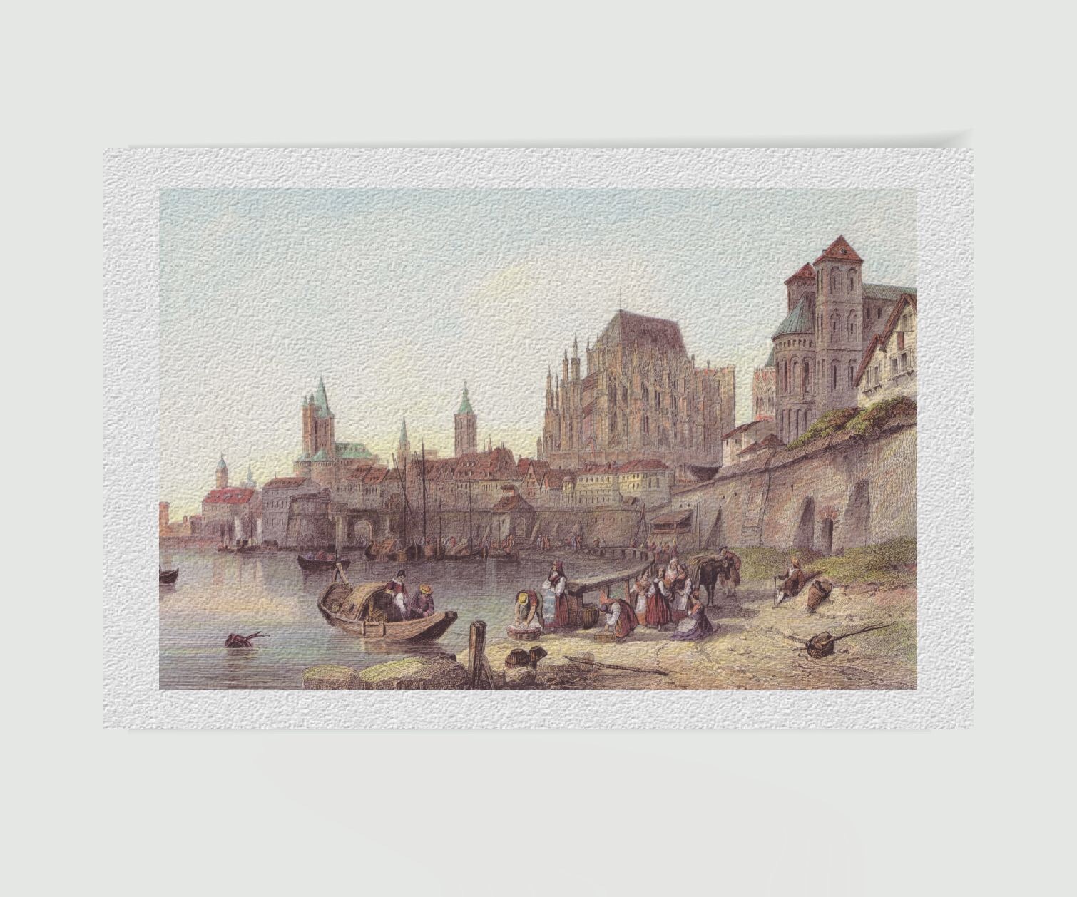 Der Stahlstich spielt sich am Ufer des Rheins ab und zeigt das alltägliche Leben in der Stadt Köln Mitte des 19. Jahrhunderts. Am Flussufer sind Frauen bei der Arbeit zu sehen, während ein Boot gerade anlegt und die Szene belebt. Auf dem Rhein selbst finden sich zahlreiche Boote und Schiffe, die die Bedeutung des Flusses als Verkehrs- und Handelsader unterstreichen.