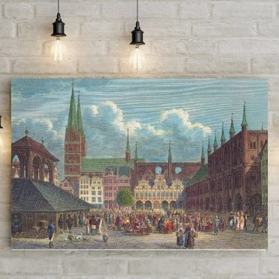 Diese historische Stadtansicht von Lübeck ist weit mehr als ein dekoratives Wandbild. Sie fängt das pulsierende Leben auf dem Marktplatz um 1820 ein und zeigt die Hansestadt in ihrer Blütezeit. Ideal für Liebhaber historischer Stadtansichten, Sammler klassischer Druckgrafik und alle, die Lübeck mit Geschichte, Farbe und Atmosphäre in ihren Wohnräumen präsentieren möchten.