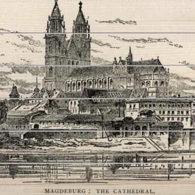 Diese Skizze, welche um circa 1900 gezeichnet worden ist, ist wieder erwartend für solche eine Art der Zeichnung, extrem detailverliebt. Im Fokus steht der Dom von Magdeburg, der den meisten Platz dieser Skizze einnimmt. Darüber hinaus sieht man auch noch das Leipziger Tor sowie zahlreiche andere Gebäude. Besonders schön ist die Spiegelung im Wasser anzusehen, welche sich im unteren Bereich dieses Kunstwerkes befindet. Insgesamt ist dieses Kunstwerk sehr gelungen und stellt den Dom zu Magdeburg sehr gut dar, ebenso wie das Leipziger Tor.