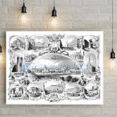 München, die Stadt der Könige spiegelt dieses Kunstwerk auf den Punkt exakt wider. Dieser Stahlstich wurde um 1850 gefertigt und zeigt als Mittelpunkt einen Panoramablick über die damalige Stadt. Um dieses Hauptbild sind viele verschiedenen Sehenswürdigkeiten dargestellt. Etwa die Frauenkirche beziehungsweise der Dom der lieben Frau sowie andere bedeutende Gebäude. Königlich sind die zahlreichen Umrandungen der einzelnen Sequenzen. In der Mitte unten ist beispielsweise das Wappen von Bayern ersichtlich. Darüber hinaus kann man verschiedene Statuen sowie andere Verzierungen vorfinden. München von seiner schönsten Seite, zumindest vom damaligen Standpunkt gesehen. Sehr gelungen.