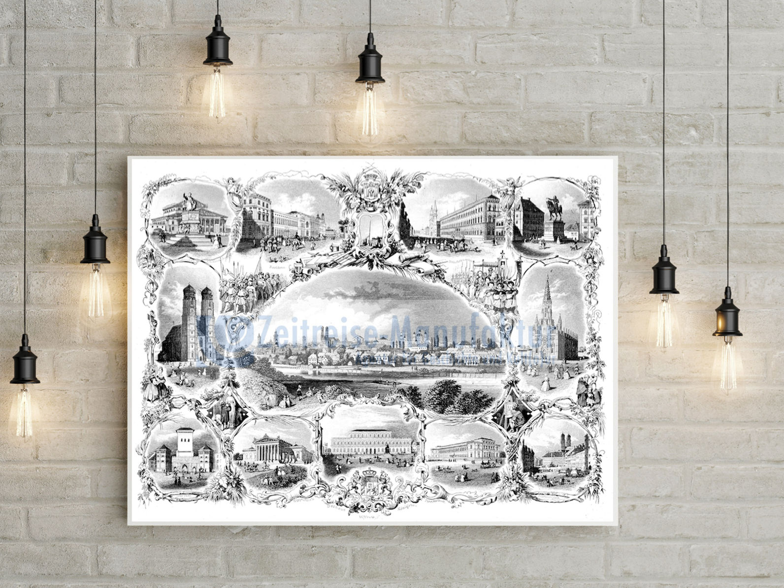 München, die Stadt der Könige spiegelt dieses Kunstwerk auf den Punkt exakt wider. Dieser Stahlstich wurde um 1850 gefertigt und zeigt als Mittelpunkt einen Panoramablick über die damalige Stadt. Um dieses Hauptbild sind viele verschiedenen Sehenswürdigkeiten dargestellt. Etwa die Frauenkirche beziehungsweise der Dom der lieben Frau sowie andere bedeutende Gebäude. Königlich sind die zahlreichen Umrandungen der einzelnen Sequenzen. In der Mitte unten ist beispielsweise das Wappen von Bayern ersichtlich. Darüber hinaus kann man verschiedene Statuen sowie andere Verzierungen vorfinden. München von seiner schönsten Seite, zumindest vom damaligen Standpunkt gesehen. Sehr gelungen.