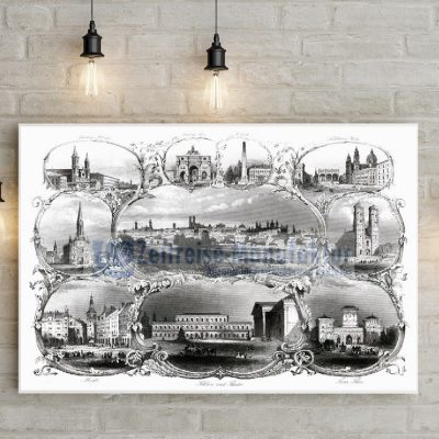 Das Historienbild „München Stadtansicht Souvenirblatt II“ ist auf Historienbilder.de in hochwertigen Ausführungen erhältlich: