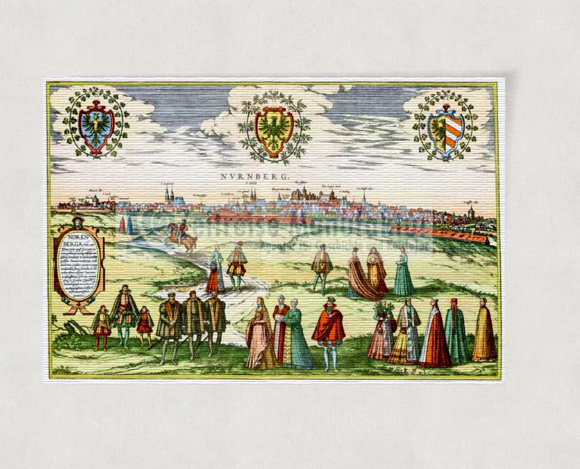 Diese historische Stadtansicht von Nürnberg ist weit mehr als ein dekoratives Wandbild. Sie ist ein wertvolles kulturhistorisches Dokument, das die Struktur und Bedeutung einer der einflussreichsten Städte des 16. Jahrhunderts eindrucksvoll vermittelt. Ideal für Liebhaber historischer Stadtansichten, Sammler klassischer Druckgrafik und alle, die ein ausdrucksstarkes Stück deutscher Geschichte in ihren Räumen präsentieren möchten.