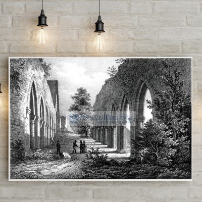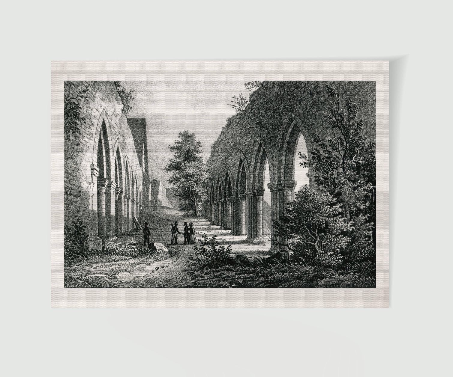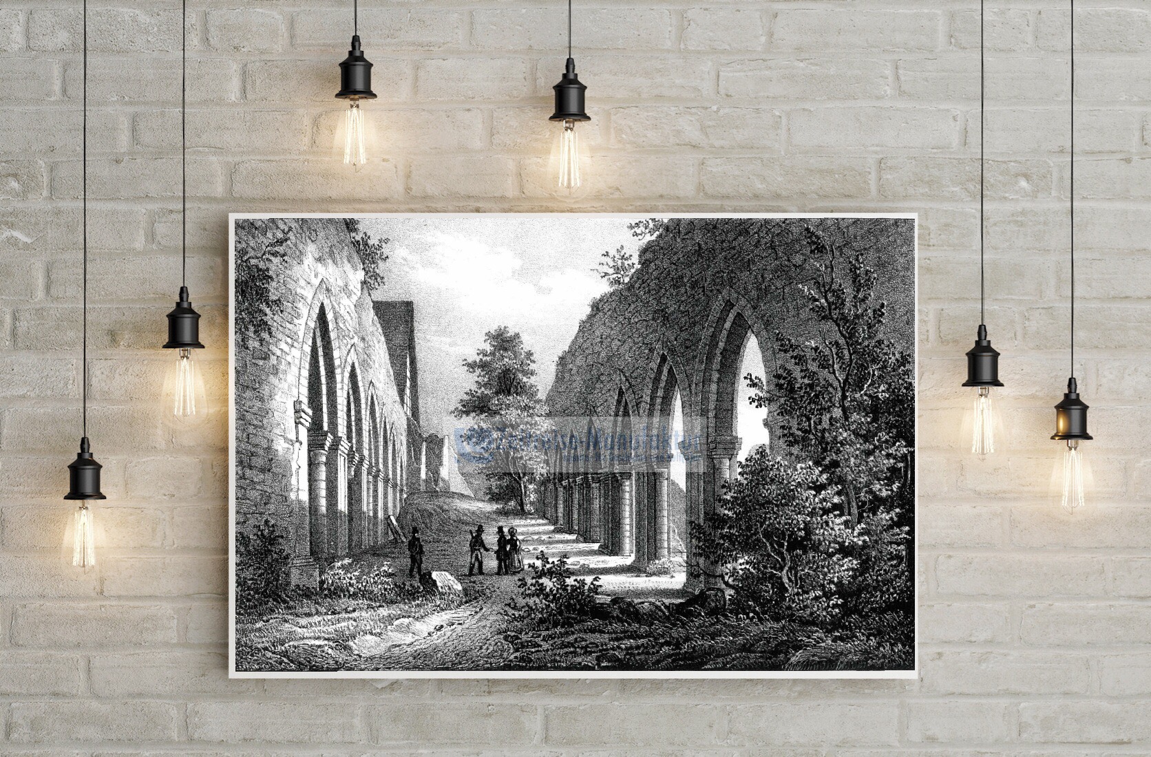 Der auf Historienbilder.de angebotene restaurierte Neudruck bewahrt die kräftige Linienführung sowie das stimmungsvolle Zusammenspiel von Architektur und Landschaft dieser historischen Ruinenansicht und macht sie erneut erlebbar.