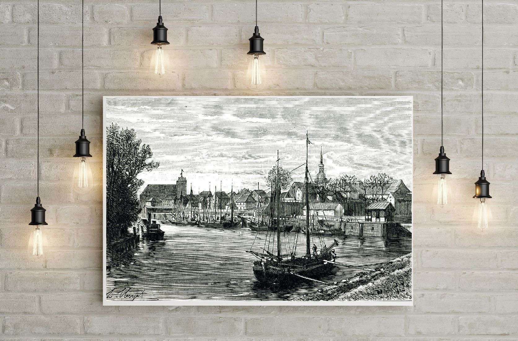 Diese historische Hafenansicht von Stade ist weit mehr als ein dekoratives Wandbild. Sie zeigt die Stadt als lebendigen Handelsplatz mit reichem maritimem Erbe und verbindet Schifffahrt, Architektur und Stadtgeschichte zu einem stimmungsvollen Zeitdokument. Ideal für Liebhaber maritimer Motive, Sammler historischer Stadtansichten und alle, die die Geschichte der Stadt Stade stilvoll in ihren Räumen präsentieren möchten.