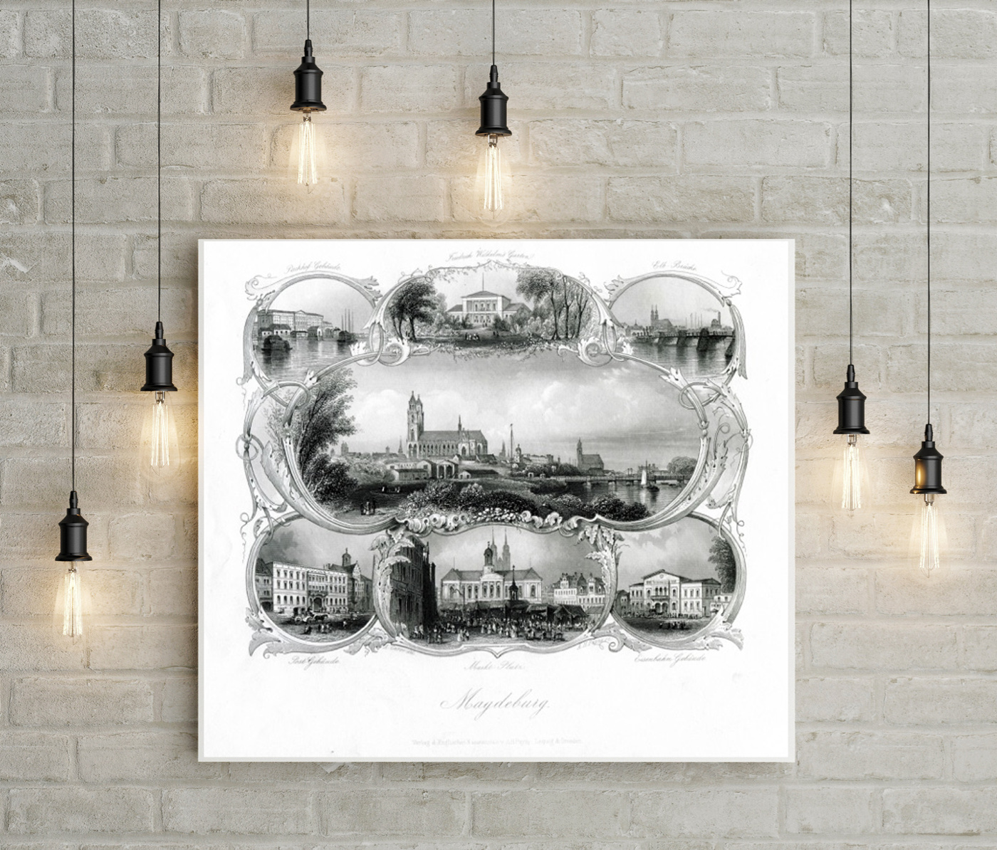 Dieser Stahlstich von circa 1850 ist einfach nur wundervoll! Im Fokus steht ein Blick über die Stadt Magdeburg mit Hauptaugenmerk auf den Dom. Um dieses Hauptbild sind verschiedene Sehenswürdigkeiten zu sehen, die die Stadt Magdeburg zur damaligen Zeit eben ausmachten. Alle einzelnen Sequenzen sind darüber hinaus beschriftet und mit aufwendigen Schnörkeln verziert und voneinander abgetrennt. Dieses Souvenirblatt ist nicht nur etwas ganz Besonderes, sondern auch etwas Einzigartiges und lässt die schöne Stadt Magdeburg hell und freundlich erstrahlen. Ein wirklich sehr gelungenes Kunstwerk.
